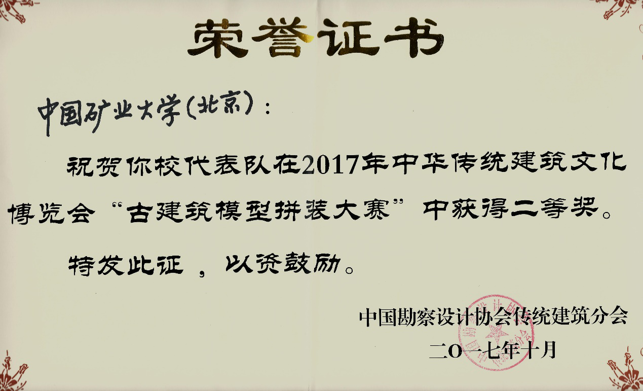 2017年10月28日,在由中国勘察设计协会传统建筑分会举办的“中国建筑文化博览会——全国大学生古建模型拼装大赛”中,美高梅4858线路登录建筑系四名同学牛锎、李小明、王辉、张宇所组成的参赛队伍在郑利军老师的带领下以优异的成绩荣获二等奖。