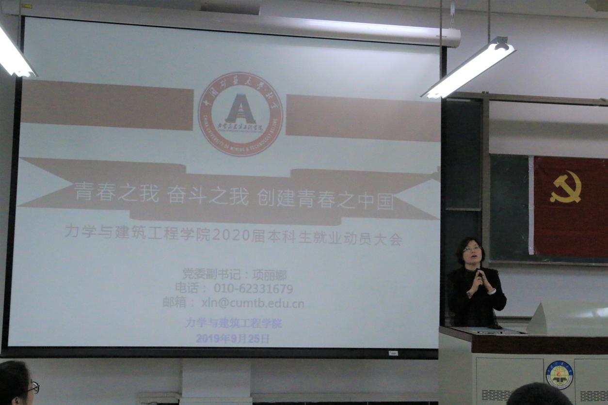 接下来,学院院党委副书记项丽娜以“青春之我,奋斗之我,创建青春之中国”为主题进行讲话。项书记结合“不忘初心,牢记使命”的本质与真谛,就国家宏观战略部署情况,国家人才缺口局面以及本科生就业整体形势与状况、近年来学院本科毕业生去向和发展状况、学院就业升学质量、就业过程中遇到的相关问题和个人在求职中需要注意的方面,进行了专业和细致的讲解。项书记深入浅出的用同学们的身边事为例,表达了学院对于每一名学生的爱护和重视,希望同学们能真正重视本次主题教育,以此为契机,坚定爱国爱党的决心,树立爱校的情怀。