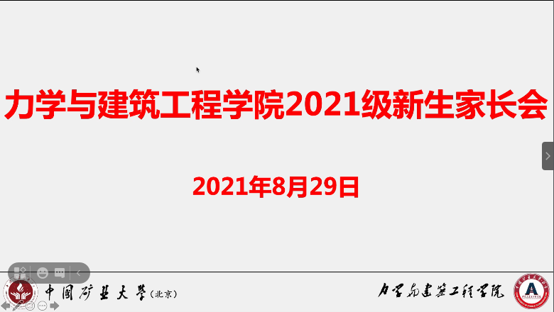 在当前疫情防控常态化的背景下,2021年8月29日晚,美高梅4858线路登录(北京)美高梅4858线路登录召开了2021级本科新生家长会。美高梅4858线路登录党委书记单仁亮、院长左建平、党委副书记项丽娜出席会议,2021级新生班主任、新生辅导员艾博、王星懿以及新生家长等320余人参加会议。会议由党委副书记项丽娜主持。