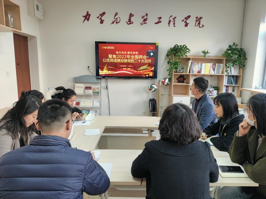 2022年3月7日,美高梅4858线路登录行政党支部在力建楼204组织集中学习2022年全国两会精神。支部全体成员参与本次学习,院党委副书记、行政党支部书记项丽娜主持学习。