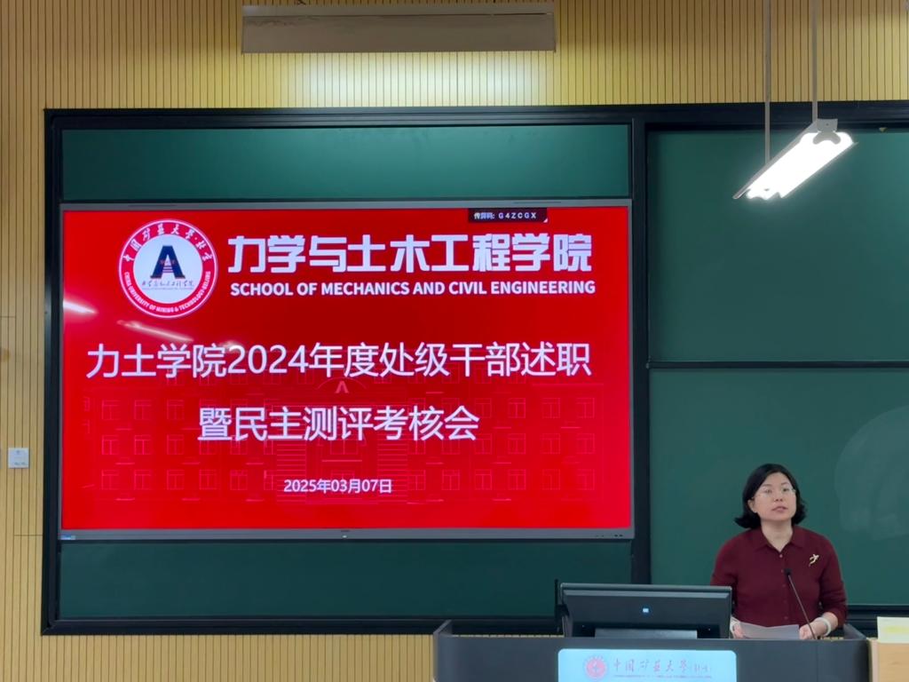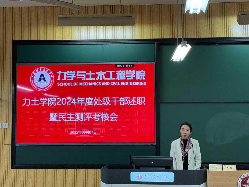李帅会上指出,为深入学习贯彻习近平新时代中国特色社会主义思想,认真贯彻落实党的二十大和二十届二中、三中全会精神和全国教育大会精神,进一步加强学院处级领导班子和干部队伍建设,根据学校党委部署要求,学院首次开展述职会和民主测评,以全面客观地考核处级干部政治表现、业务能力和履职尽责情况。她强调,2025年是“十四五”收官和“十五五”谋划之年,更是面向教育强国全面布局、高位推进之年,力土学院要持续在党建引领、人才培养、学科建设、师资队伍等事业方面出亮点成绩,坚持稳中求进、以进促稳、守正创新、先立后破,在攻坚克难中成就事业、在敢闯敢干中开辟通途,为学院全面一流建设添砖加瓦,为学校早日建成世界一流能源科技大学贡献力土力量。