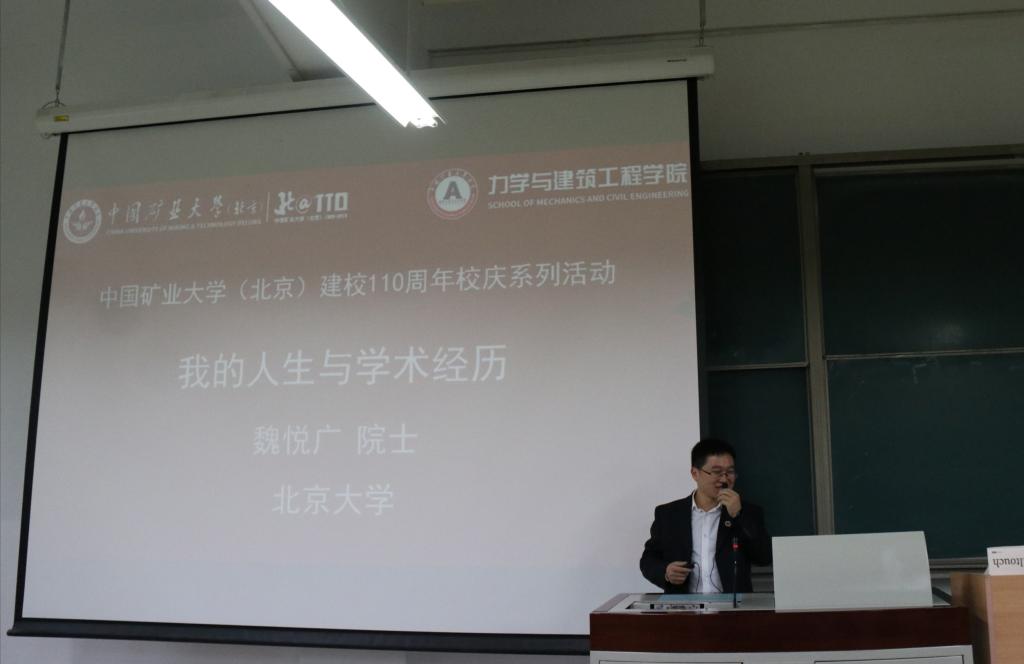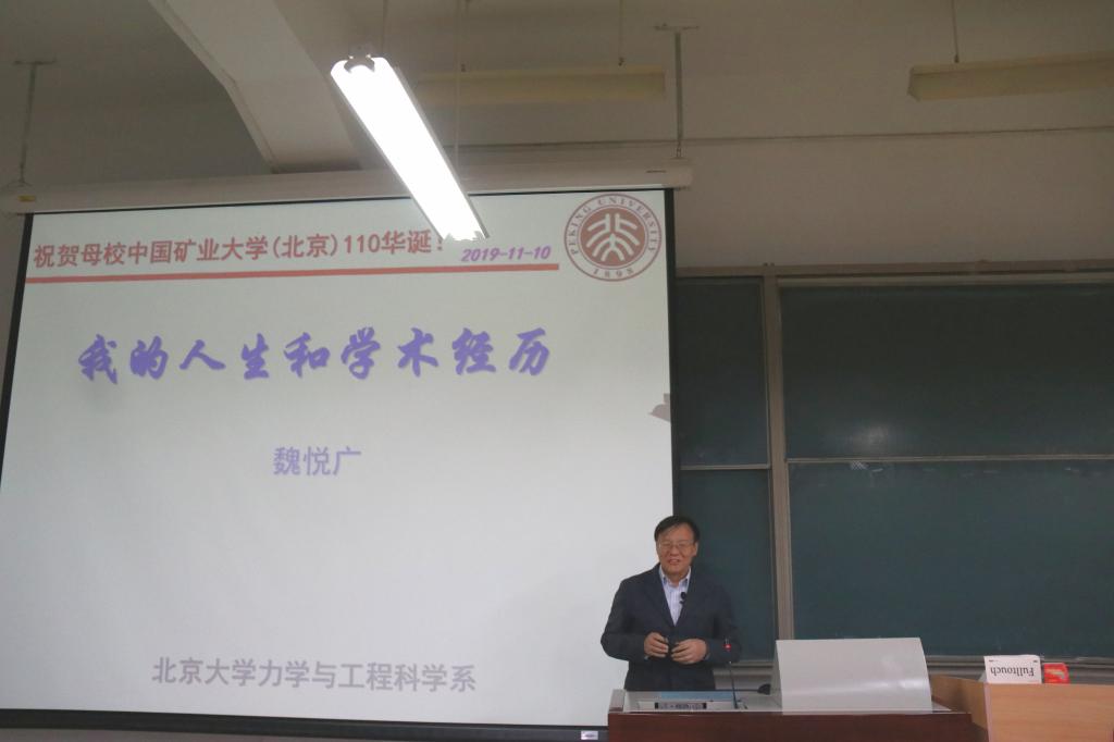 魏悦广院士以《我的人生和学术经历》为主题,从自己1977年恢复高考,考入西安矿业学院开始,分享了自己在西安矿业学院、山东矿业学院、美高梅4858线路登录北京研究生部、清华大学、中科院力学所、美国哈佛大学、北京大学等高校和科研机构40多年来的求学、治学、工作经历,回忆了多位老师在求学期间对自己的谆谆教诲,向在座师生展示了自己多年来的重大科研成果。并鼓励学生们努力学习,报效祖国。报告结束,魏院士回答了在场学生的提问,并与参会教师、部分学生一起合影。